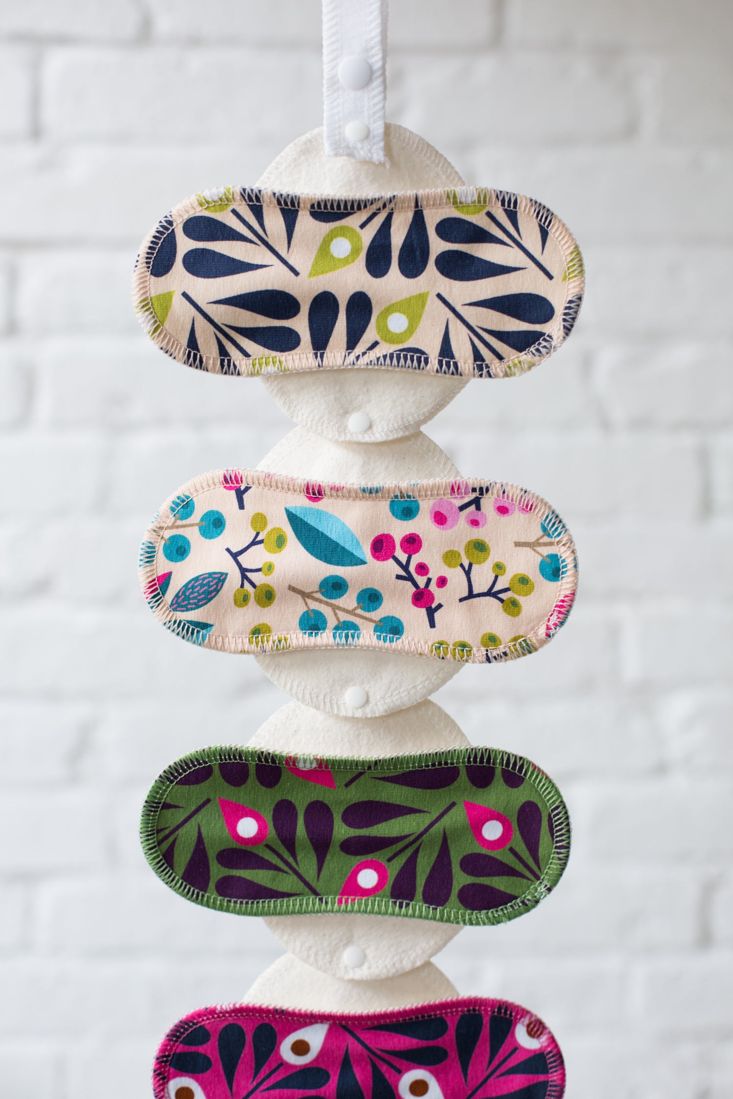 Racman cloth daily panty liners are available in a variety of materials (cotton, organic cotton, bamboo), sizes (S, M, thong) – either in natural unbleached color, as well as a range of vibrant colors and patterns (with white or black wings).